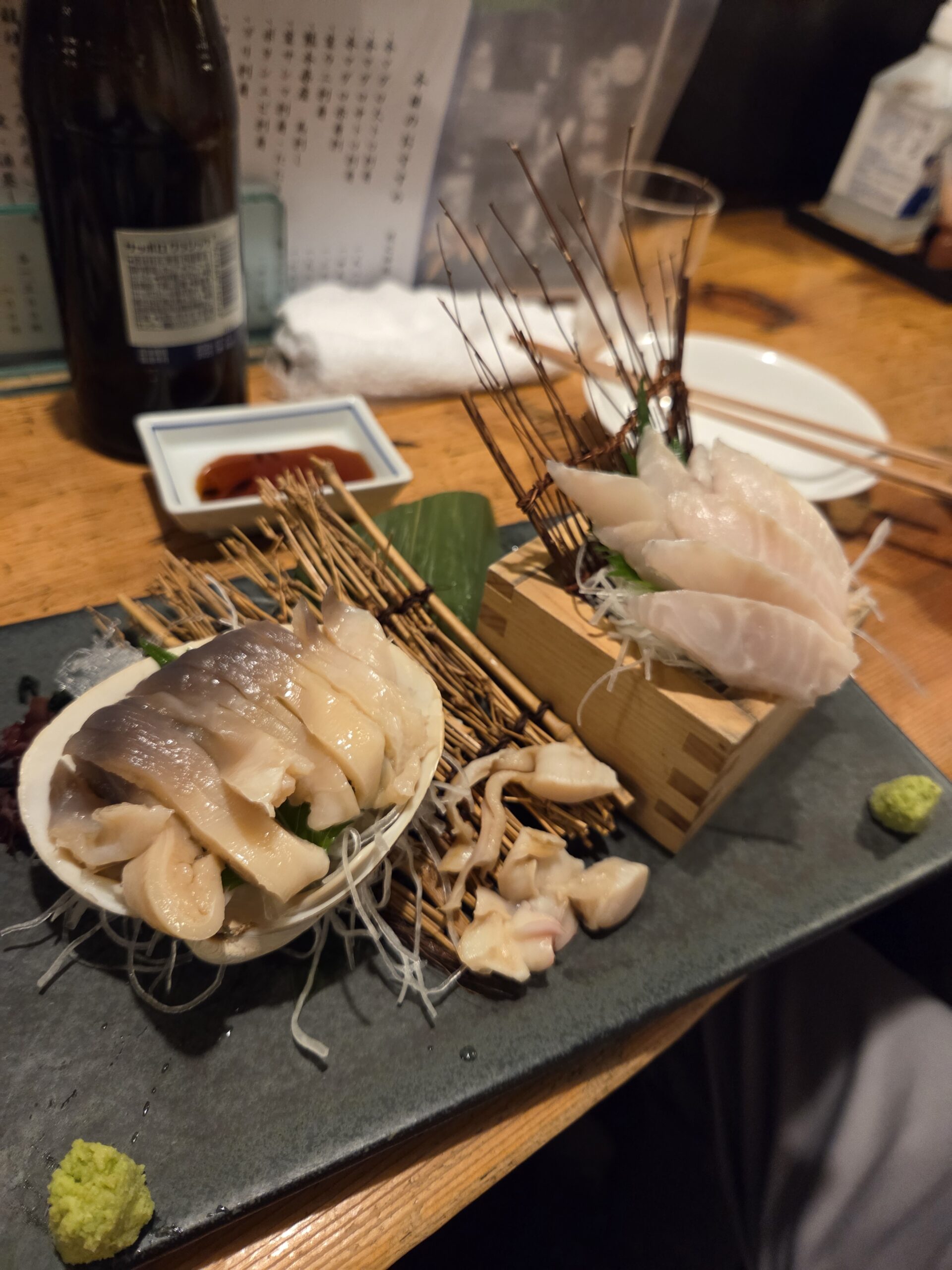 山のような短冊のメニューが至る所に貼られていて、何を頼んだらいいか迷う迷う!「八角の刺身食べたことある?あんまり見ないんだけどね。旨いよ~」と北海道出身の知人に言われていたのでメニューに見つけて小躍り。貝好きの私は北寄貝刺も迷わず注文。初めて食べた八角の刺身は、思っていたより脂が乗っていて、ぷりっぷり。北寄貝はとにかく甘~い!本シシャモも身がしっかりしていて旨みが強い。そしてダンナさんが大好きな真ホッケは、とにかく大きい!そして身が厚い!