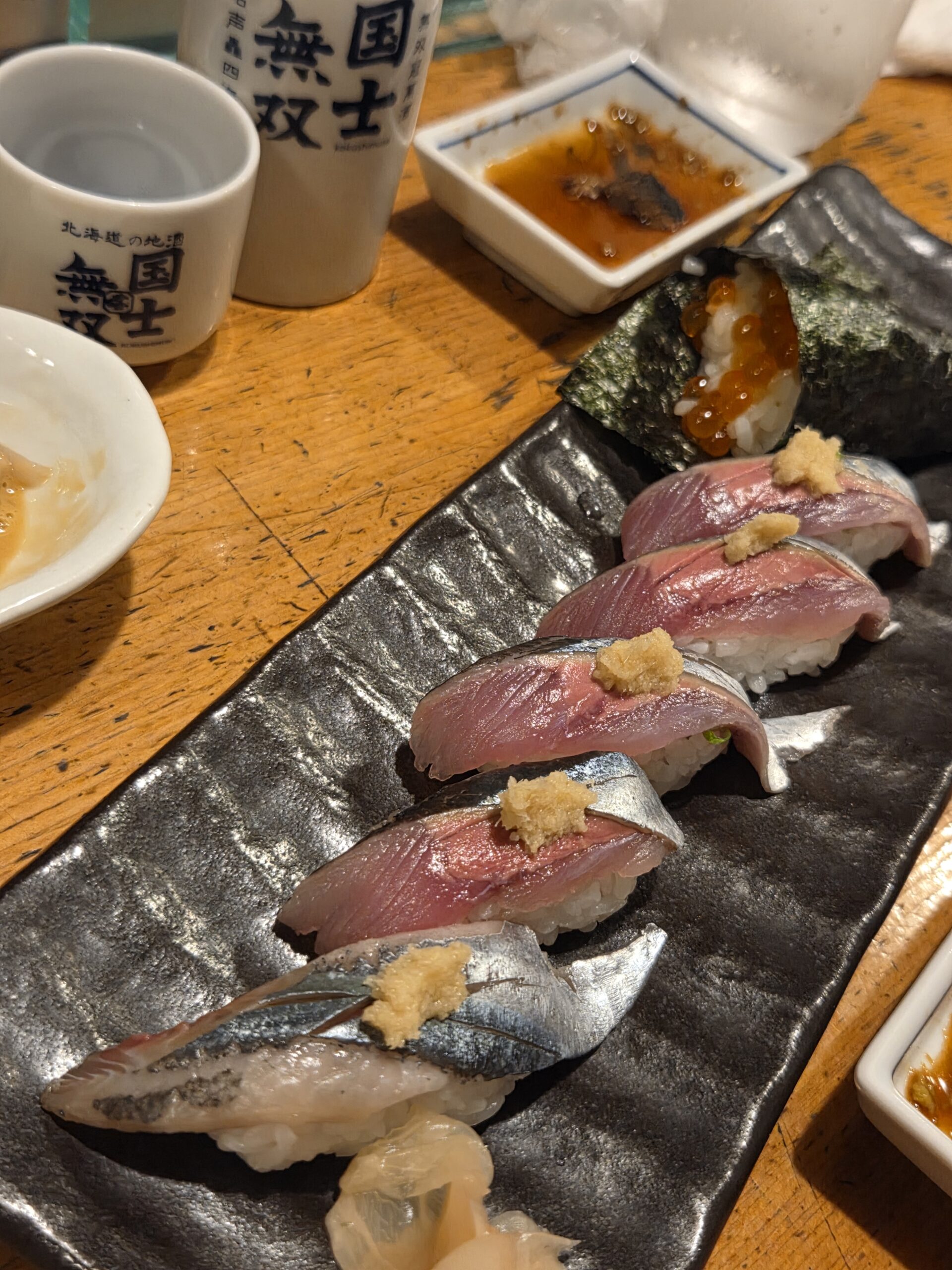 ふと、頭の上の短冊に目をやると「本日のおすすめ品 生ラムの肩ロース網焼」の文字。「特製ダレにつけこんだ生肉はやわらかくてうまい!!」の説明付き。迷わず追加。本当に柔らかくて噛めば噛むほどじゅうっと肉の旨みが染み出てくる。甘塩っぱい濃いめのタレ、最高です。いくらでも食べられそう。  他にもアスパラバター焼きなどを頼み、最後の〆はお寿司だよねと、今が旬の秋刀魚の握りと、北海道ならではの山わさび巻きをオーダー。いや~、本当に脂が乗っていて旨すぎだわ、秋刀魚。山わさびは思ったよりツンときて、でも山葵よりは強くなく、〆にはぴったり。
